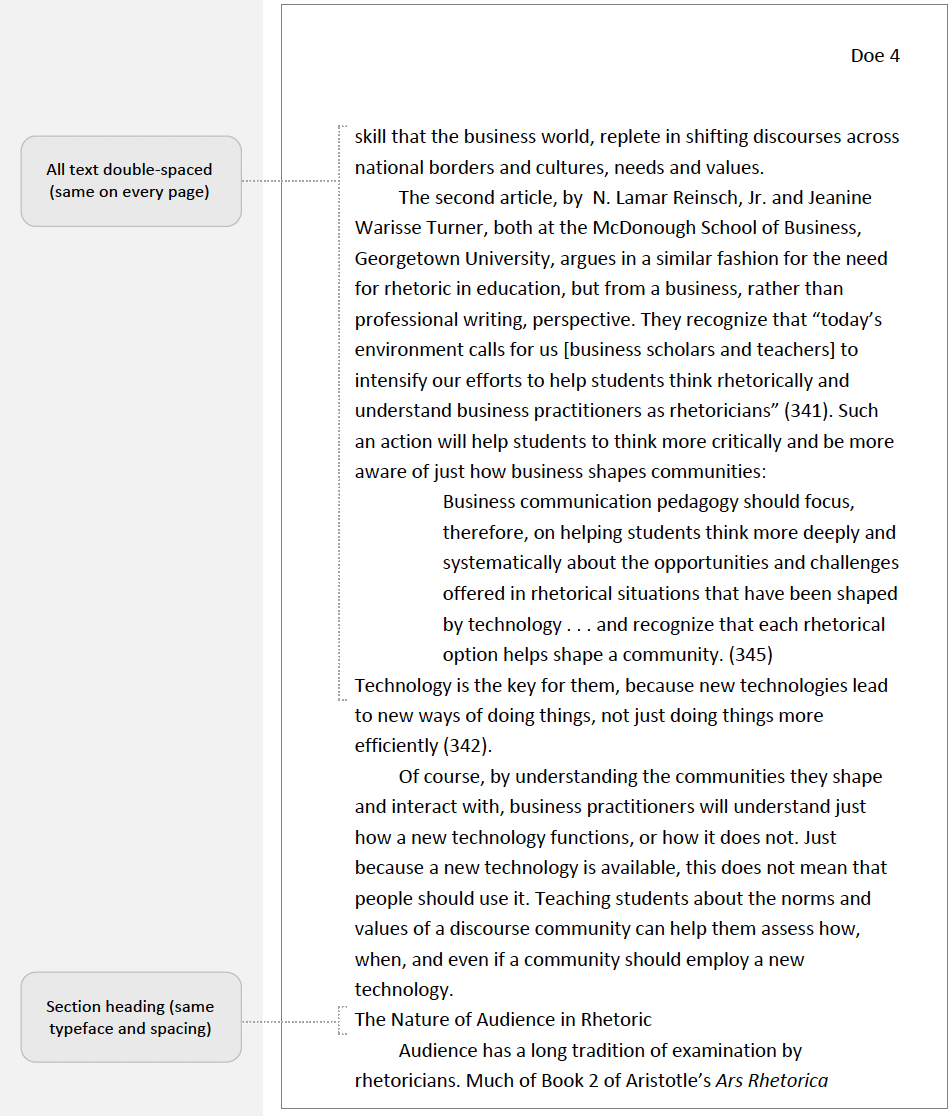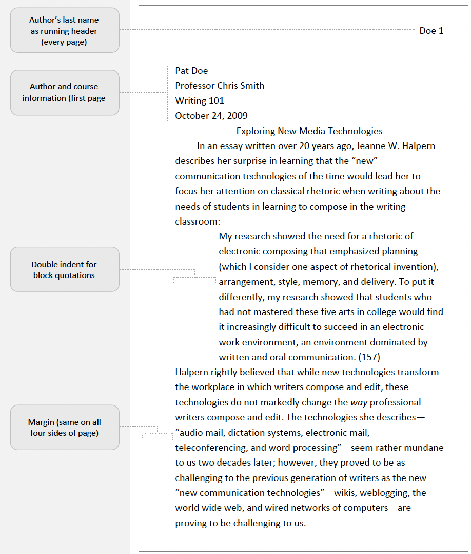 The way you use words and place text on a page influence the audience’s ability to comprehend information. Much the way the shape of a stop sign indicates the same meaning as “STOP” to a driver, readers understand information in part through its placement and format. As a result, there is consistency among the papers submitted within a writing classroom and established journals in an academic field. This consistency allows readers to become accustomed to certain conventions and increases readability. When a professor reviews multiple papers formatted in the same way, for example, she can easily find the author’s name and class section on all of the papers. Likewise, students in an English class will be able to find a source from the information given in an academic journal because they can understand in-text citation and bibliographic reference.